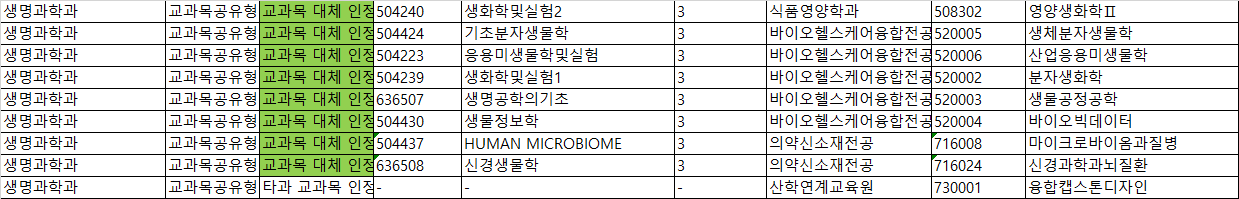[생명과학과 코드쉐어링 현황 표]
