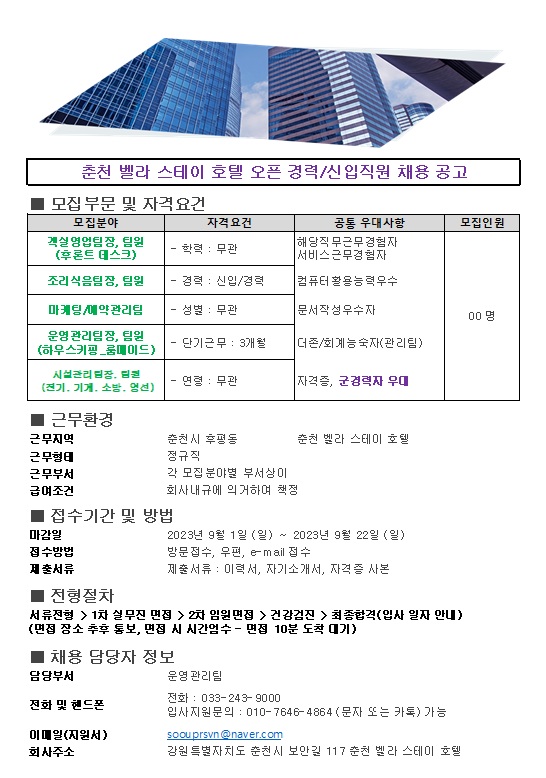 춘천 벨라 스테이 호텔 오픈 경력/신입직원 채용 공고