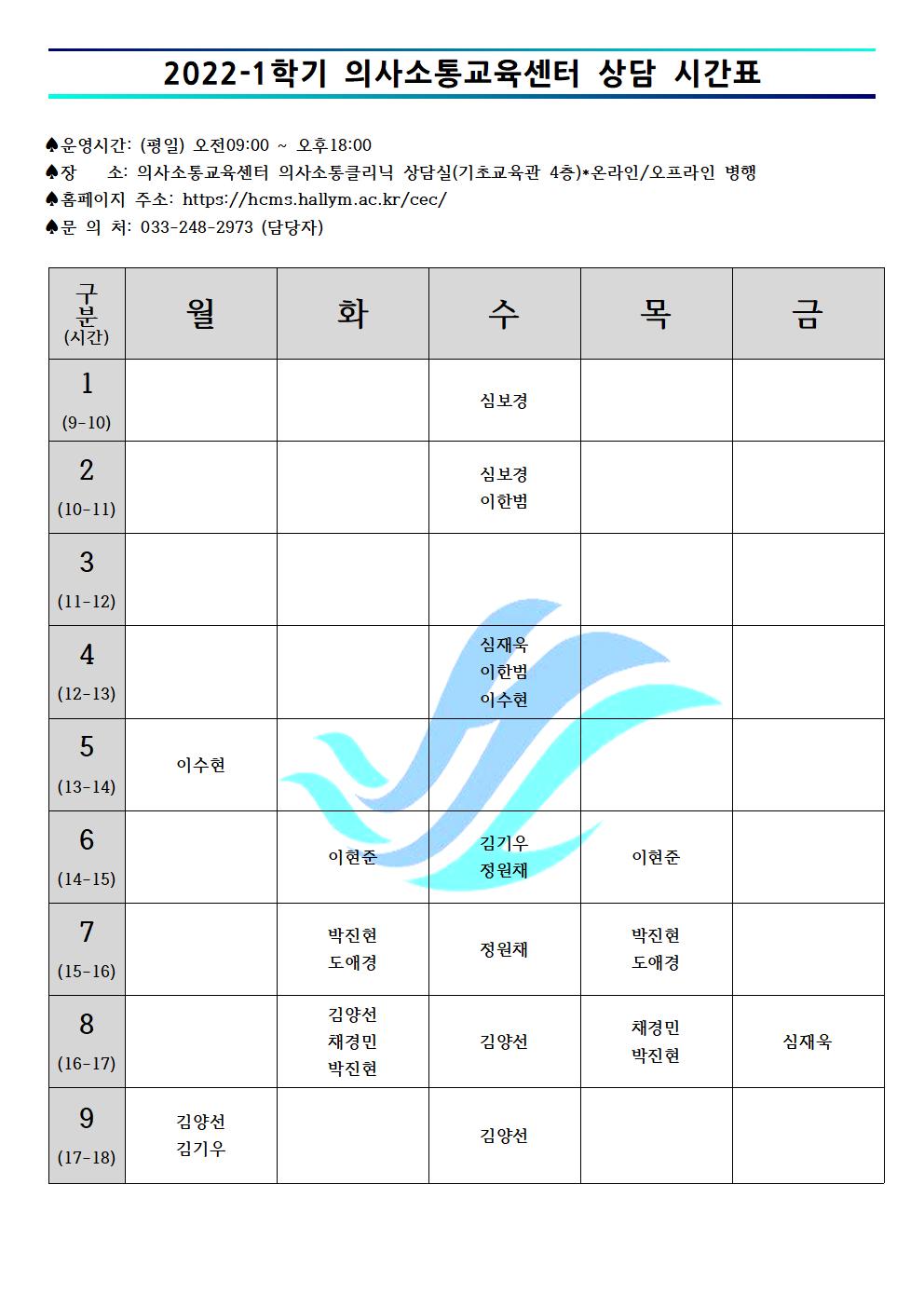 2022-1학기 의사소통교육센터 의사소통클리닉 상담시간표