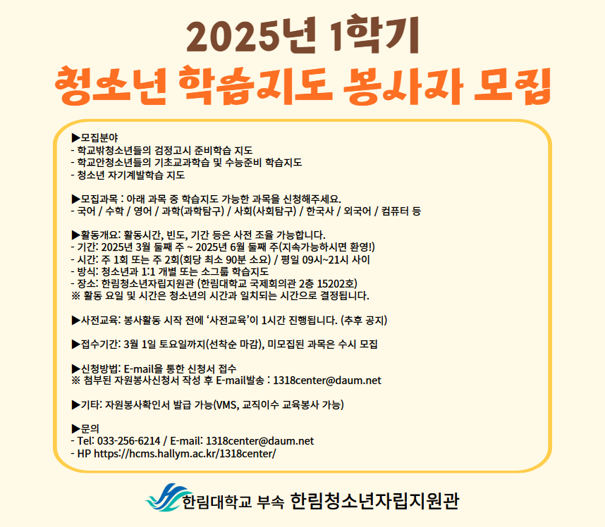 [한림청소년자립지원관] 2025년 1학기 학습지도 멘토봉사자 모집 안내