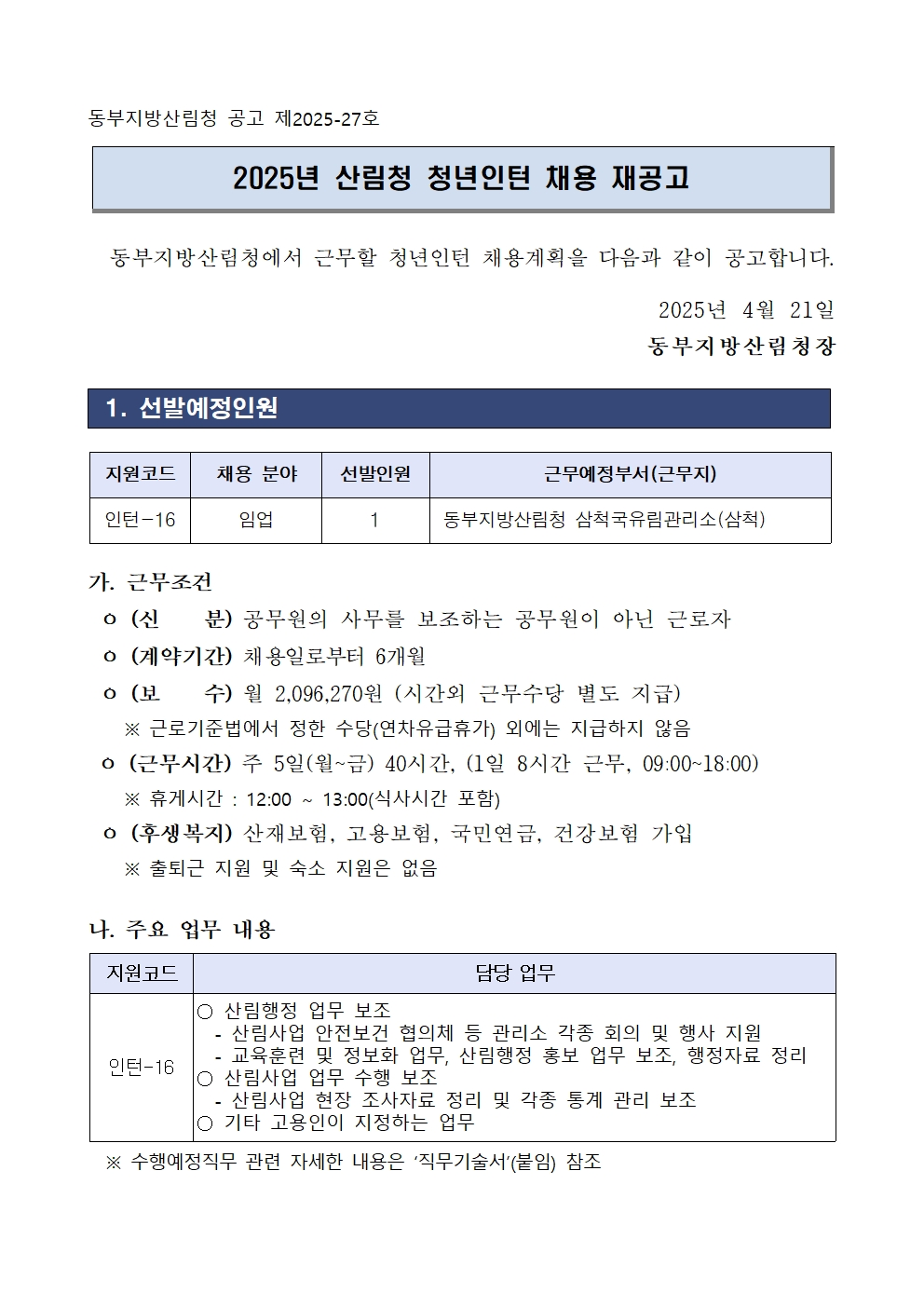 • [동부청 공고 제2025-27호] 2025년도 산림청 청년인턴 채용 재공고.hwp