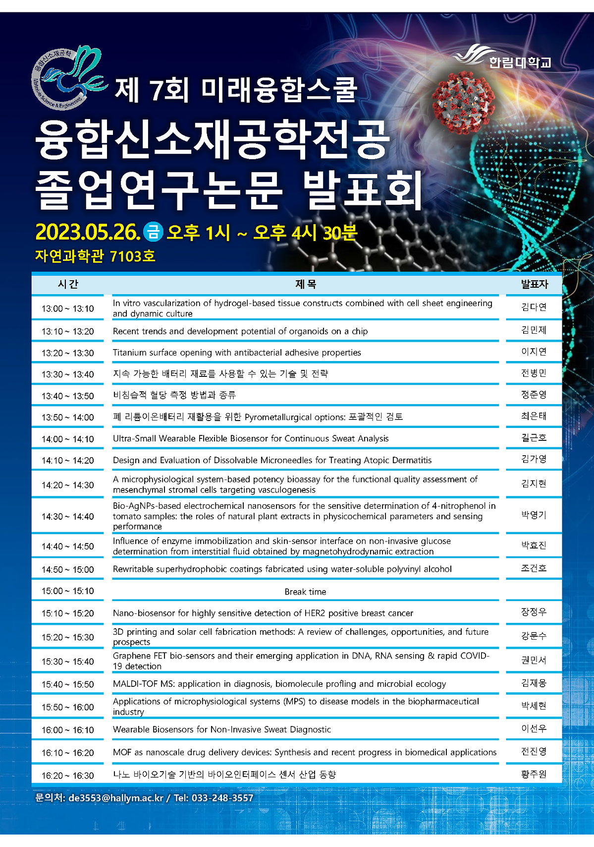 한림대학교 미래융합스쿨 융합신소재공학전공 제 7회 졸업논문 발표회가 2023.5.26에 개최되었습니다.