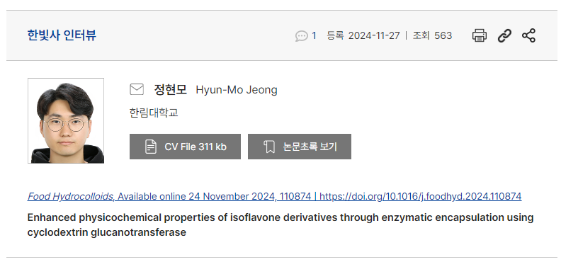 본 연구는 한림대학교 식품영양학과 식품미생물 및 발효학 연구실에서 심재훈 교수님의 지도 아래 진행되었습니다. 저희 연구실은 탄수화물 효소를 중심으로 다양한 연구를 수행하고 있습니다. 주로 유전자 클로닝을 통해 신규 탄수화물 효소를 발굴하거나, 이러한 효소를 활용하여 물성이 개선된 변성 전분을 개발하고 이를 실제 제품에 적용하는 연구를 진행합니다. 또한, 소수성 물질의 포접을 통해 수용해도를 개선하는 연구에도 중점을 두고 있으며, 식품 및 기능성 소재의 활용성을 높이는 데 기여하고 있습니다.